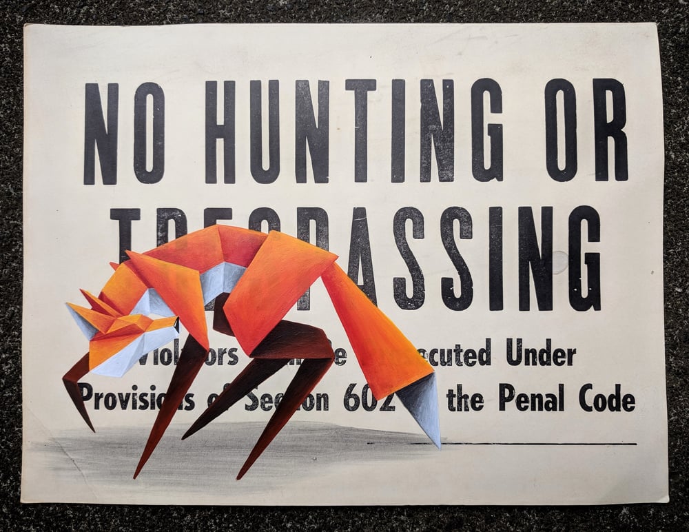 Acrylics on vintage, screen printed "No Hunting" cardboard sign (300gsm).